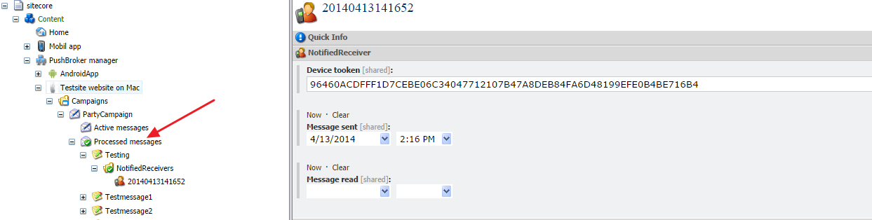 There are some interesting events you can hook up on, for instance the PushOnOnNotificationSent. In this case if the message is successfully send I’ll set a “message send” date on the subscriber/receiver.
