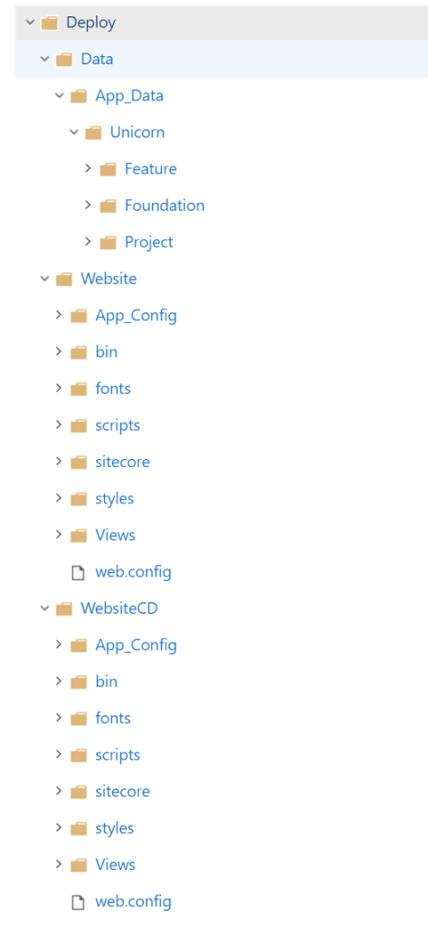 Here we place the web.config’s (from the Azure CM instance and the Azure CD instance), some unicorn configs and the Domain.config.