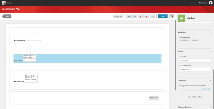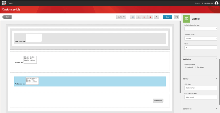 In the form we will wrap the Fast select control in a section. For the Fast select component we will use the ListBox control. To make it work we need to set the selection mode to Multiple and give it the class name “fastSelectTest”.