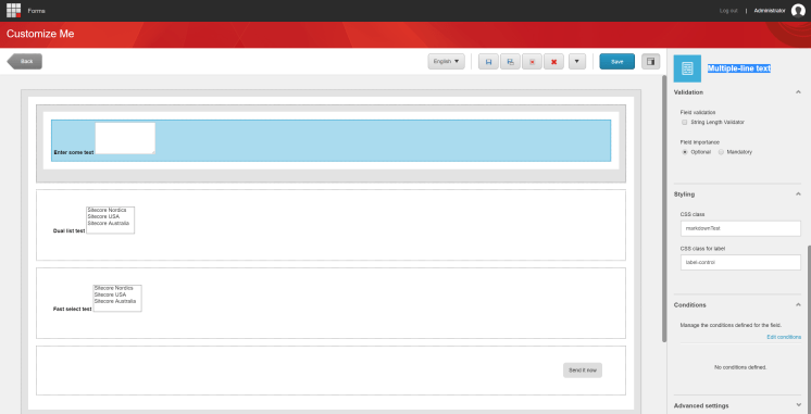 Now for the fun stuff š We will create a form in the “Forms tool”. In the form we should have a section to wrap around the markdown component. For the markdown component we will use the Multiple-line control. In order to make it work we just need to set the class name to “markdownTest”.