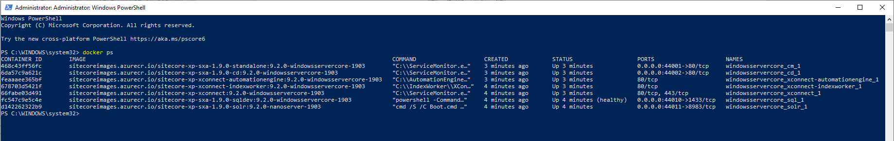 Just to be sure, we want to verify that the Docker containers have been created successfully. Start/open up a PowerShell window and enter the following command: