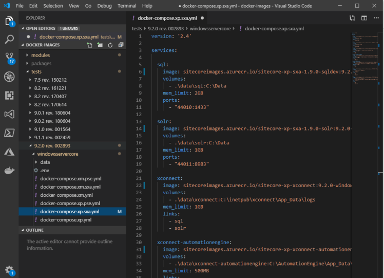 Let’s dive into our forked GitHub repository. Locate tests folder and select 9.2.0 rev. 002893. Open up windowsservercore, now you will see a bunch of docker-compose files. So much fun stuff to play with 🙂 How about we try out SXA running on CM and CD? Let’s select the docker-compose.xp.sxa.yml file.