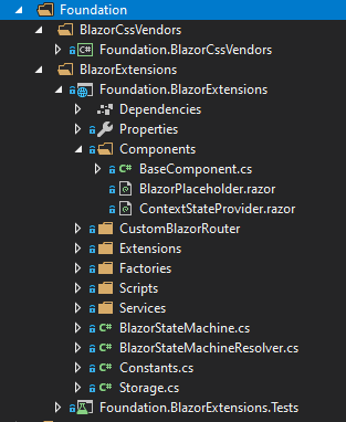 In the Project layer we will have have the layout components, like MasterBlaster.razor(the master layout), Navbar.razor, OneColumn.razor etc. Here is also the App component, that is where we will set the dynamic routes. Let me come back to that πŸ™‚