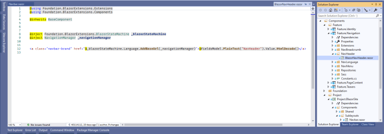 As I mentioned above the “navbar” placeholder has the component Project.BlazorSite.Components.Sublayouts.Navbar. So let’s take a look at the component – Navbar.razor.
