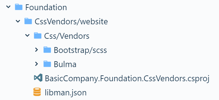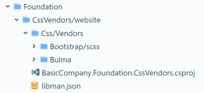 Instead of using Node for downloading the Bulma CSS framework, we will use Libman. I put it in a separate project – Foundation.CssVendors which references the Microsoft.Web.LibraryManager.Build package.
