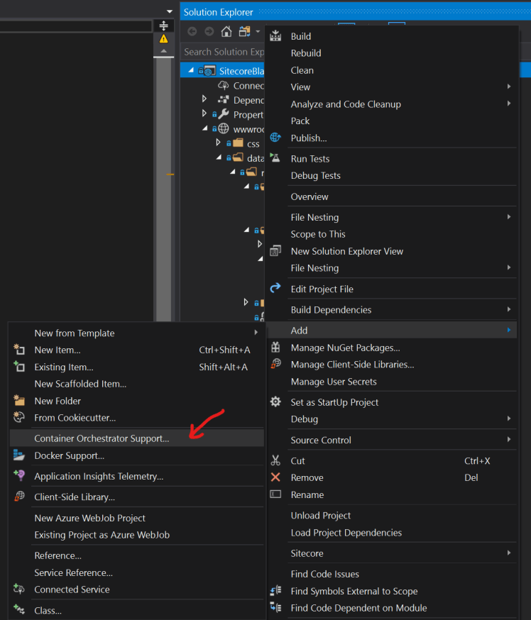 Next will be to switch back to the “Solution view”(in Visual Studio) and add the new project we created – docker-compose.dcproj.