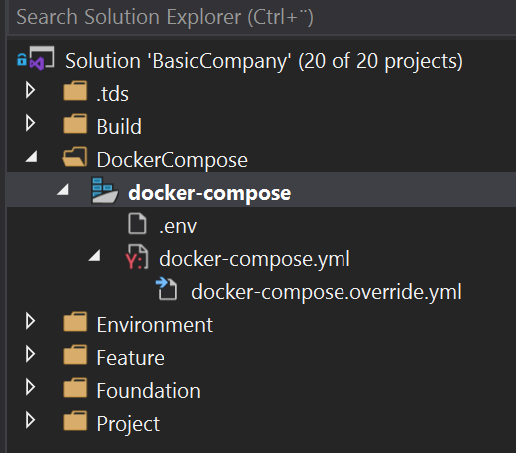 Instead, we will create the project manually. We will switch to folder view in our solution(no need to use the File Explorer) and navigate to the src folder in folder helix-basic-tds-with-docker-vs2019-project-type. Here we will create a DockerCompose folder. Right click and create the following files: