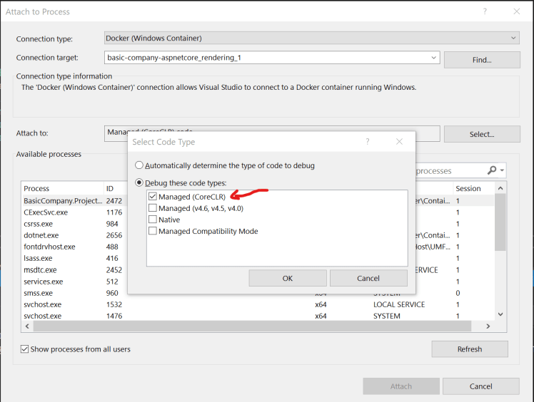 So why a post then? Well, in my case I wanted to debug the rendering host(the one that runs in Asp.Net Core 3.1) So I attached the debugger but nothing happened, I could not understand why. But after some serious hair pulling, I noticed that I attached to the wrong code type – Managed(v4.6, v4.5, v4.0):