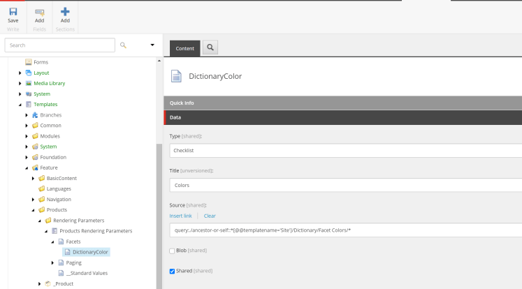 Time for some localization 🙂 If you guys remembered we used Sitecore Dictionary items for the facets. If we look at the response from the Sitecore Layout Service for the component GraphQLProductList. The values in DictionaryColor contains the id’s from the dictionary items. We also set the item ID as Key on the Sitecore Dictionary Entry item.