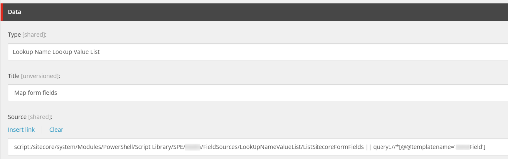 In the “Lookup Name Lookup Value List”, we want to point to the “selected” Sitecore Form and list all its forms fields