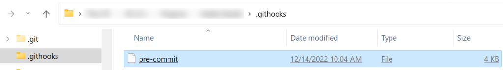The solution is this. We will create a new folder in the root, .githooks. Here we will have a “copy” of Anton Tishchenko‘s great pre-commit file. This means it is now versioned 🙂