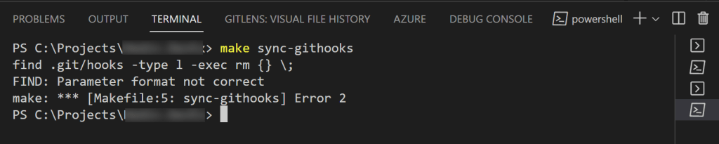 But unfortunately, I could not get the “make sync-githooks” to run in PowerShell.