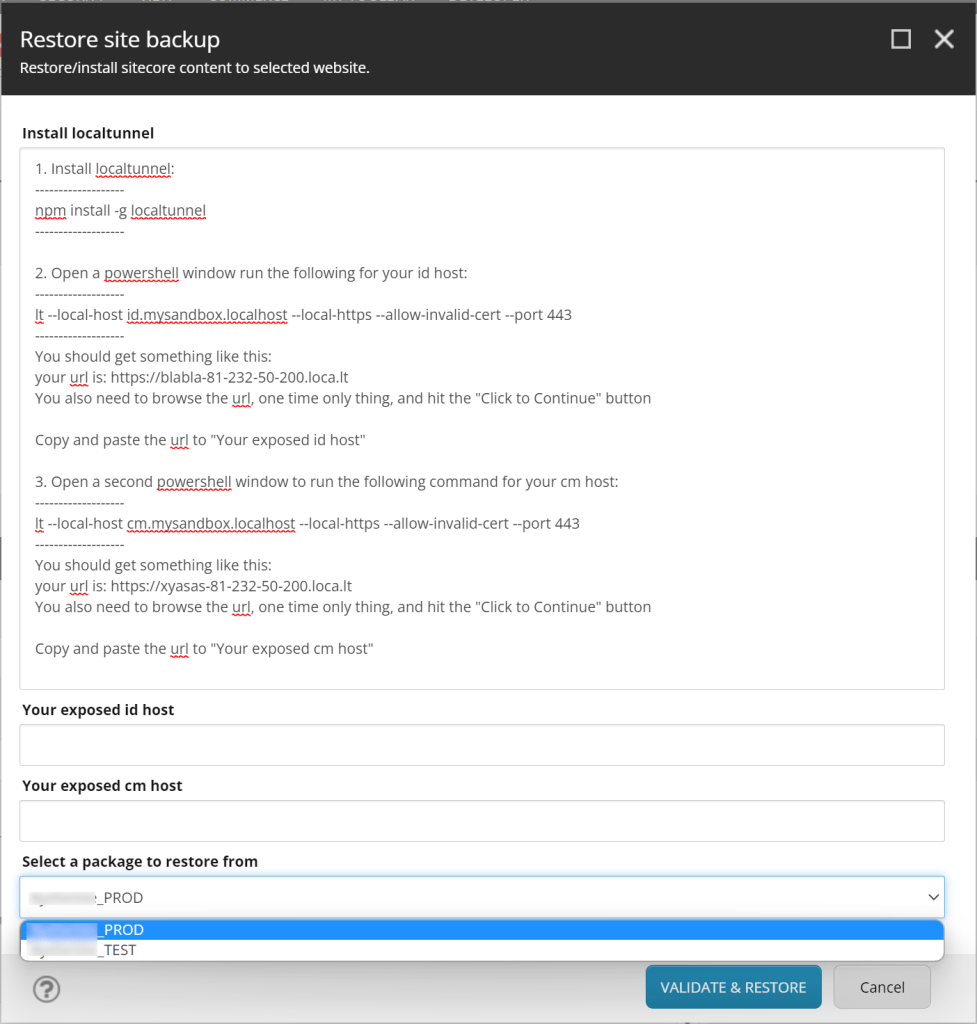 *And yes, we could work with the good old Sitecore packages, but it’s not fun 😉 - We also want to select the environment from which we want to restore/install the package. For example, let’s say we want to install a Sitecore content (NuGet) package from production to our local Sitecore environment.