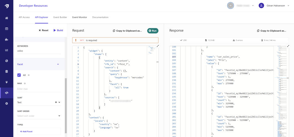 Let’s try out the facet in the API explorer in Sitecore Search: