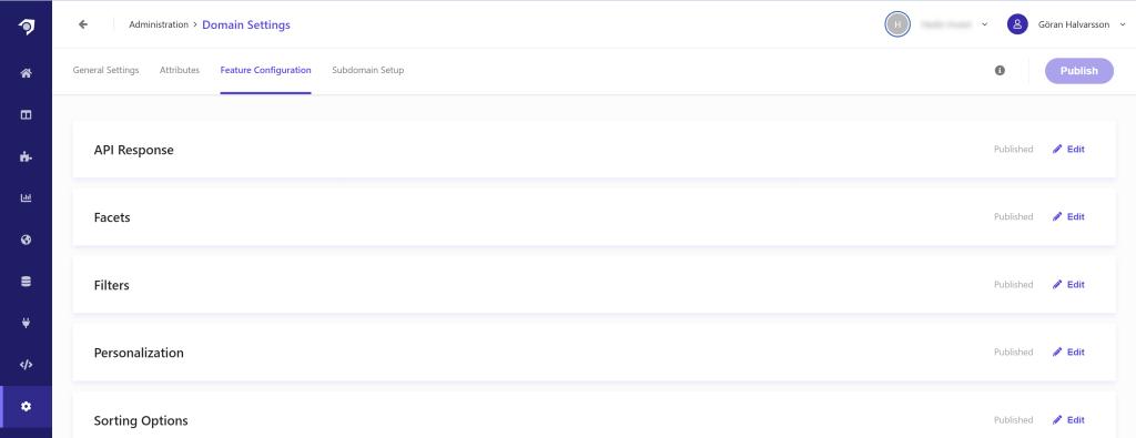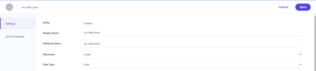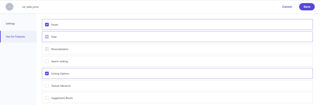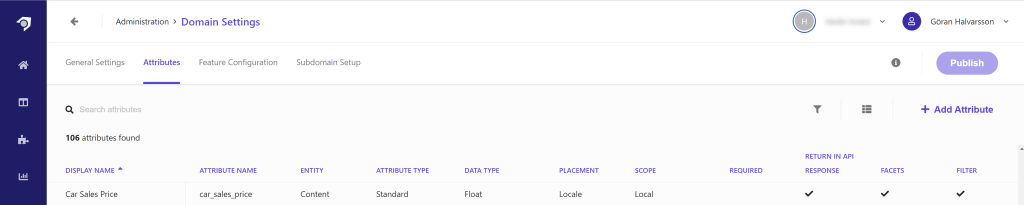 First, we will develop a “range” facet within Sitecore Search, targeting the attribute field car_sales_price, which is already established in Sitecore Search. Notably, these attributes are accessible through the Domain Settings.