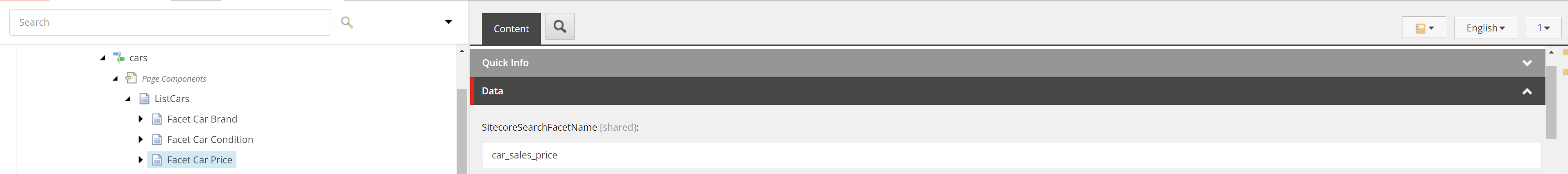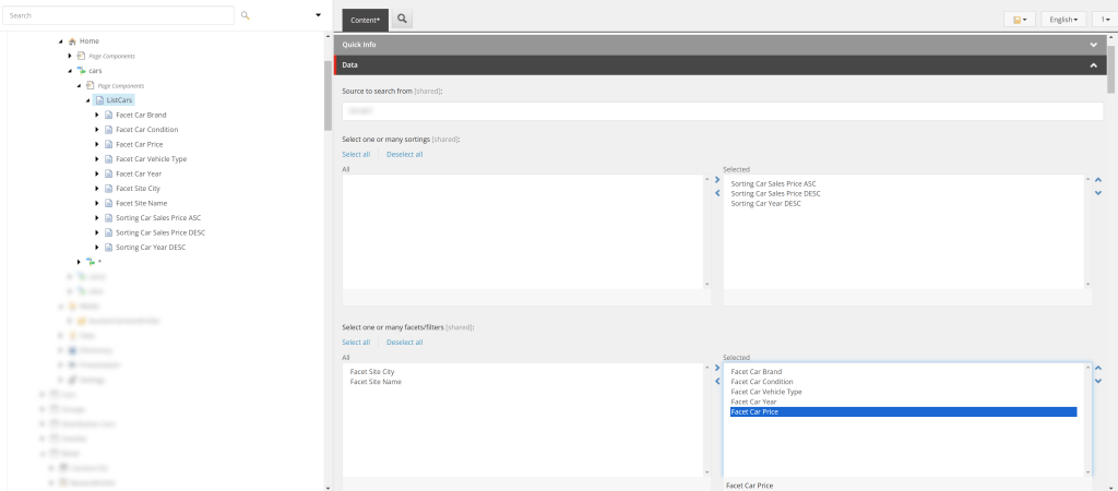 Notice how we “call” the second component SitecoreSearchCarsListWidget and we populate it with Sitecore fields, like the defaultFacets={facetsFromSitecore}
