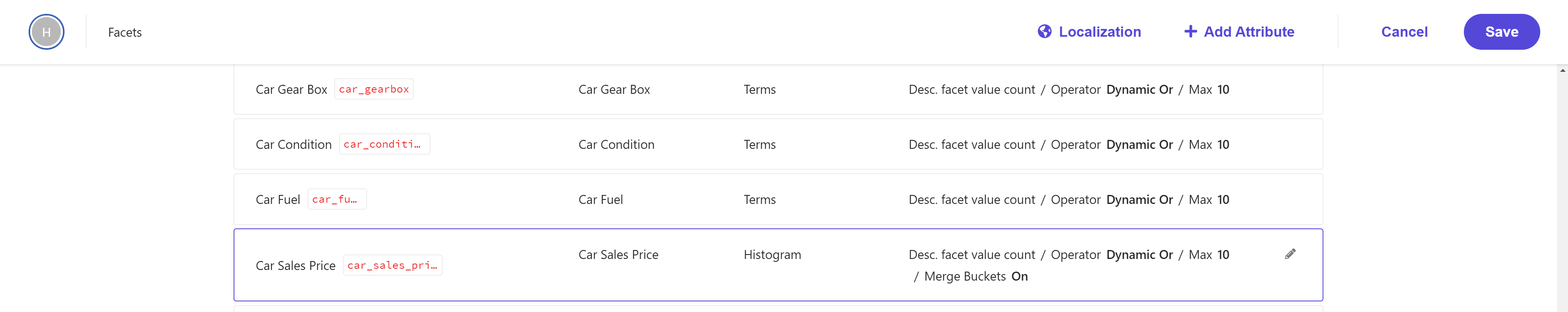 Let’s have a look at the newly created Facet, which is based on the field car_sales_price.